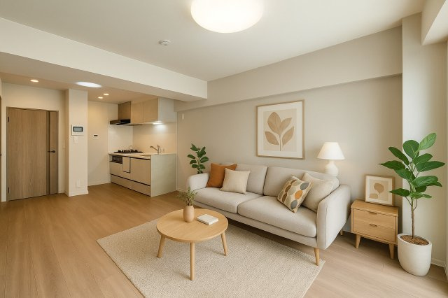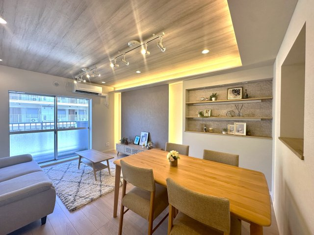 【居間・リビング】空間の広がりと柔らかな採光に包まれたリビングダイニング。毎日の暮らしに“ちょっと特別”を感じさせてくれる、住まいの中心となる空間です。